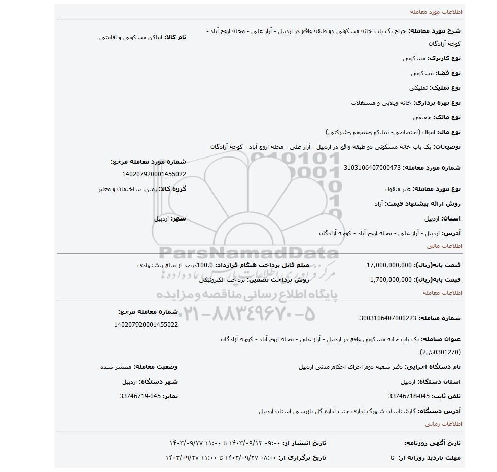 عنوان معامله: یک باب خانه مسکونی واقع در اردبیل - آراز علی - محله اروج آباد - کوچه آزادگان (0301270ش2) | ||