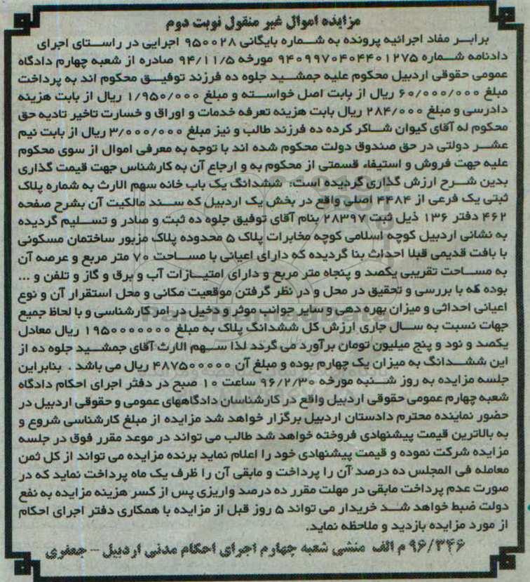 مزایده ششدانگ یکباب خانه اعیان هفتاد متر کلاسه 950028