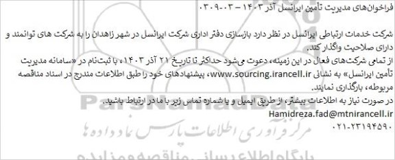 شرکت خدمات ارتباطی ایرانسل در نظر دارد بازسازی دفتر اداری شرکت ایرانسل در شهر زاهدان را به شرکت های توانمند و دارای صلاحیت واگذار کند.