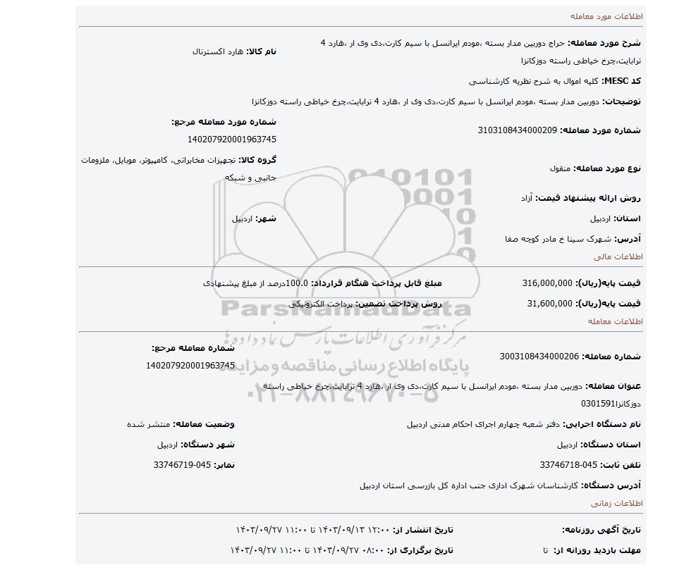 قیمت پایه(ریال): 31,600,000 | روش پرداخت تضمین: پرداخت الکترونیکی |