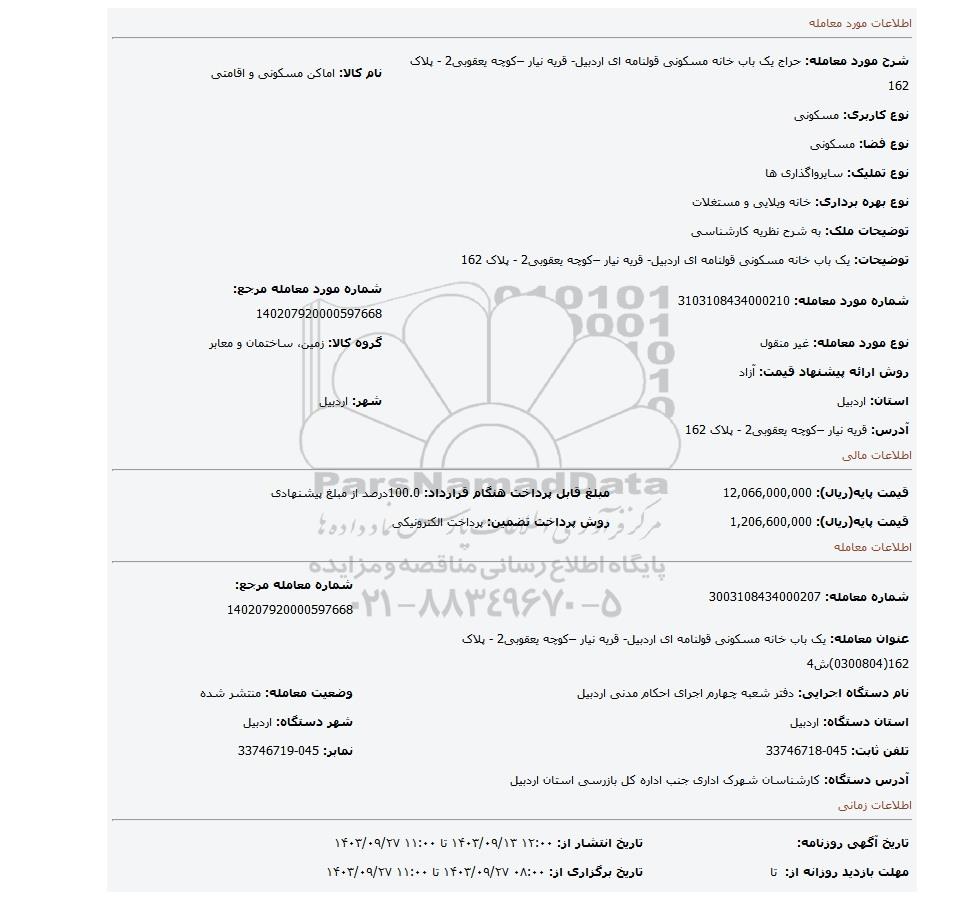 شرح مورد معامله: حراج یک باب خانه مسکونی قولنامه ای اردبیل- قریه نیار –کوچه یعقوبی2 - پلاک 162 | نام کالا: اماکن مسکونی و اقامتی | |