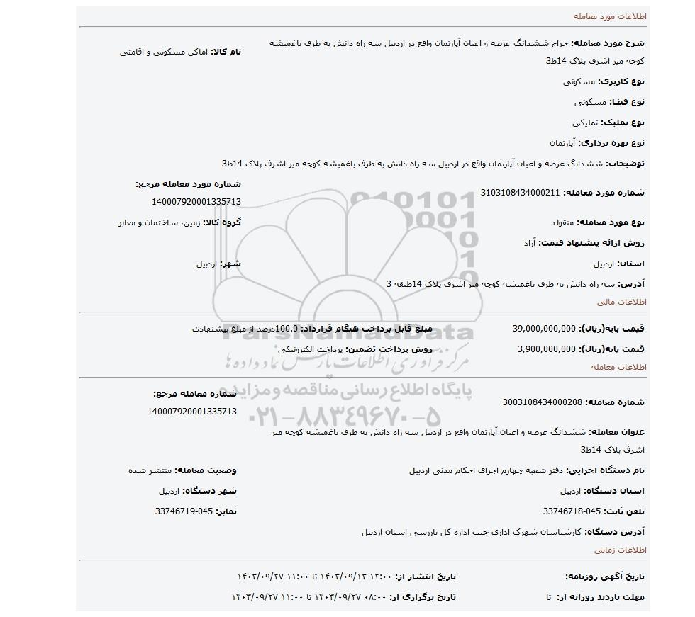 شرح مورد معامله: حراج ششدانگ عرصه و اعیان آپارتمان واقع در اردبیل سه راه دانش به طرف باغمیشه کوچه میر اشرف پلاک 14ط3نام کالا: اماکن مسکونی و اقامتی