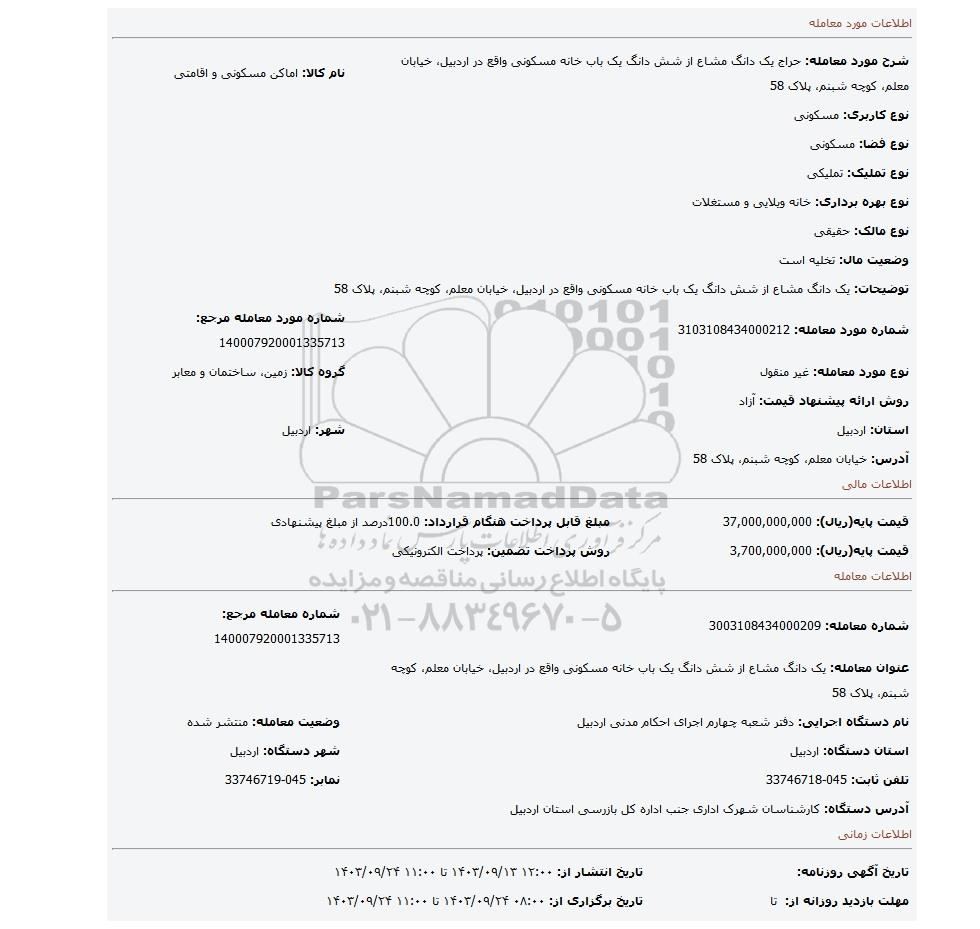 شرح مورد معامله: حراج یک دانگ مشاع از شش دانگ یک باب خانه مسکونی واقع در اردبیل، خیابان معلم، کوچه شبنم، پلاک 58نام کالا: اماکن مسکونی و اقامتی