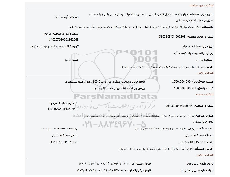 عنوان معامله: یک دست مبل 9 نفره استیل سلطنتی مدل فرانسوی از جنس راش و یک دست سرویس خواب تمام چوب فندقی | ||