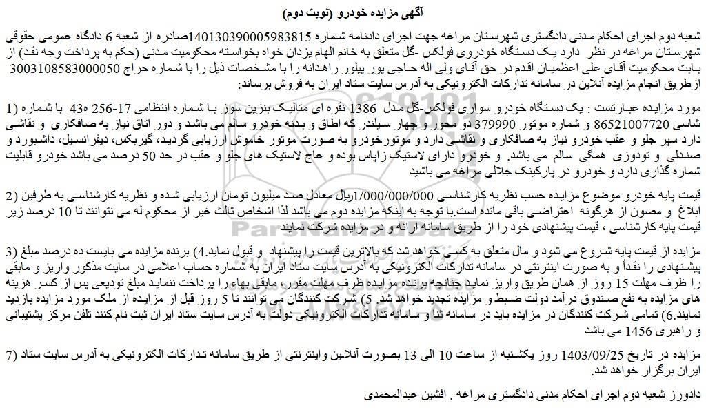 شعبه دوم اجرای احکام مدنی دادگستری شهرستان مراغه جهت اجرای دادنامه شماره 140130390005983815صادره از شعبه 6 دادگاه عمومی حقوقی شهرستان مراغه در نظر  دارد یک دستگاه خودروی فولکس -گل متعلق به خانم الهام یزدان خواه بخواسته محکومیت مدنی (حکم به پرداخت وجه نقد) از بابت محکومیت آقای علی اعظمیان اقدم در حق آقای ولی اله حاجی پور پیلور راهدانه را با مشخصات ذیل را با شماره حراج 3003108583000050  ازطریق انجام مزایده آنلاین در سامانه تدارکات الکترونیکی به آدرس سایت ستاد ایران به فروش برساند: