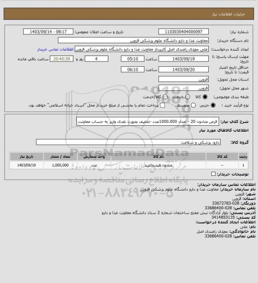 شرح کلی نیاز: قرص متادون 20 - تعداد 1000.000عدد -تخفیف بصورت نقدی واریز به حساب معاونت