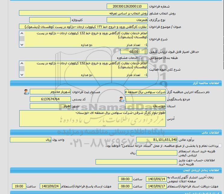 نام دستگاه اجرایی مناقصه گزار | شرکت سهامی برق منطقه ای خوزستان | مسئول ثبت مناقصه | |