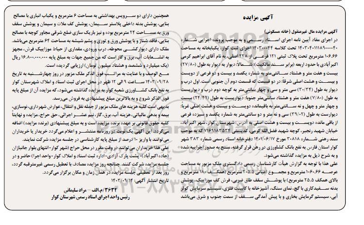 آگهی مزایده مال غیرمنقول (خانه مسکونی)