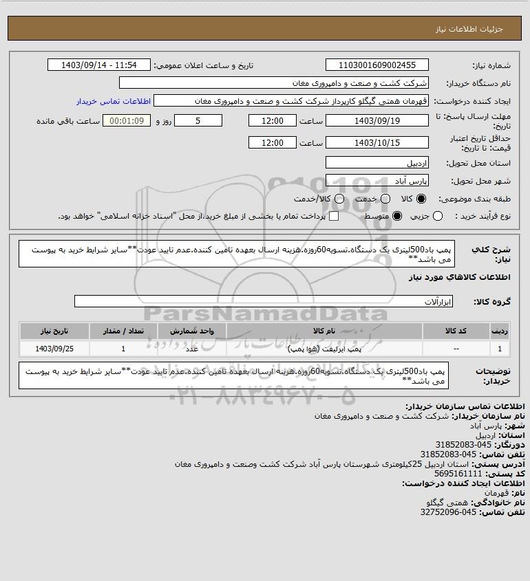 استعلام بها و موضوع استعلام استعلام پمپ باد500لیتری یک دستگاه.تسویه60روزه.هزینه ارسال بعهده تامین کننده.عدم تایید عودت**سایر شرایط خرید به پیوست می باشد** به اطلاع کلیه شرکتها و افراد متخصص واجد شرایط میرساند، آگهی گذار در نظر دارد از طریق استعلام بها، نسبت به انتخاب و دریافت پیشنهادات اقدام نماید. این استعلام با کد آگهی ثبت شده در سامانه خبرگزاری پارس نماد : 8366064 منتشر شده است. مشخصات استعلام : تاریخ شروع استعلام: 1403/09/14 آخرین مهلت ارسال پیشنهاد قیمت : 1403/09/19 و محل اجرای پروژه : استان اردبیل میباشد. استعلام قیمت مورد درخواست : استعلام پمپ باد500لیتری یک دستگاه.تسویه60روزه.هزینه ارسال بعهده تامین کننده.عدم تایید عودت**سایر شرایط خرید به پیوست می باشد** با دستهبندیهای تخصصی و گروه های مرتبط : ابزار و یراق آلات, الکتروموتور و پمپ های شناور, تجهیزات و خدمات کشاورزی و دامپروری, استعلام اطلاع رسانی میگردد.