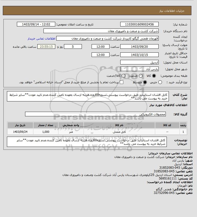 شرح کلی نیاز: کابل افشان استاندارد طبق درخواست پیوستی.تسویه60روزه.هزینه ارسال بعهده تامین کننده.عدم تایید عودت**سایر شرایط خرید به پیوست می باشد**