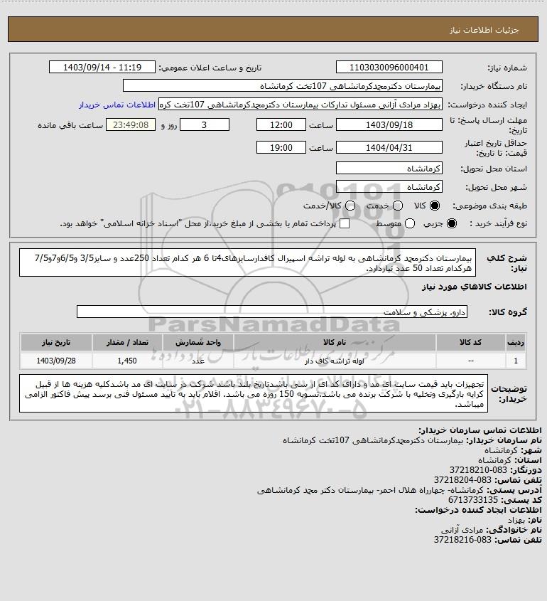 شرح کلی نیاز: بیمارستان دکترمحمد کرمانشاهی به لوله تراشه اسپیرال کافدارسایزهای4تا 6 هر کدام تعداد 250عدد و سایز3/5 و6/5و7و7/5 هرکدام تعداد 50 عدد نیازدارد.