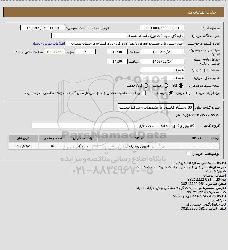 شرح کلی نیاز: 80 دستگاه کامپیوتر با مشخصات و شرایط پیوست