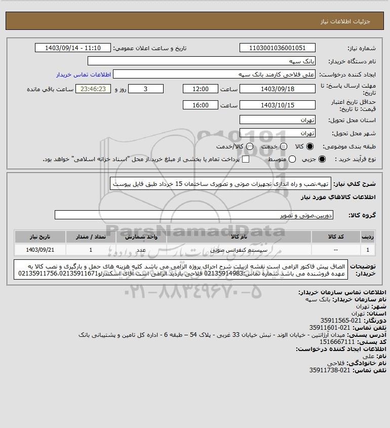 شرح کلی نیاز: تهیه،نصب و راه اندازی تجهیزات صوتی و تصویری ساختمان 15 خرداد طبق فایل پیوست