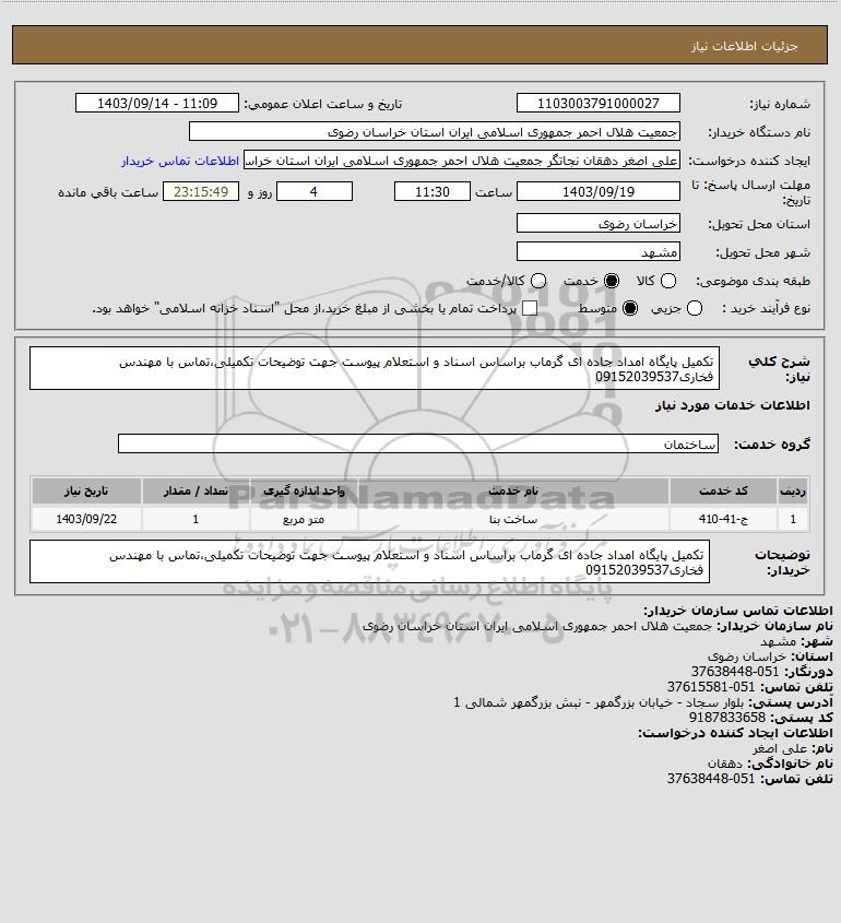 توضیحات خریدار:تکمیل پایگاه امداد جاده ای گرماب براساس اسناد و استعلام پیوست جهت توضیحات تکمیلی،تماس با مهندس فخاری09152039537