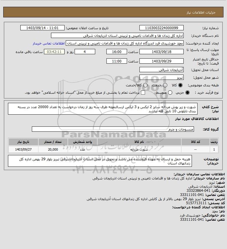 شرح کلی نیاز: شورت و زیر پوش مردانه سایز 2 ایکس و 3 ایکس ارسالنمونه ظرف سه روز از زمان درخواست به تعداد 20000 عدد در بسته بندی نایلونی 10 تایی فله نباشد