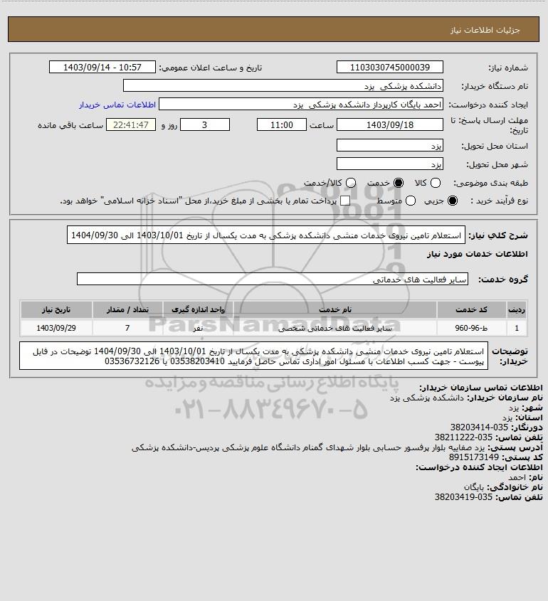توضیحات خریدار:استعلام تامین نیروی خدمات منشی دانشکده پزشکی به مدت یکسال از تاریخ 1403/10/01 الی 1404/09/30 توضیحات در فایل پیوست - جهت کسب اطلاعات با مسئول امور اداری تماس حاصل فرمایید 03538203410 یا 03536732126