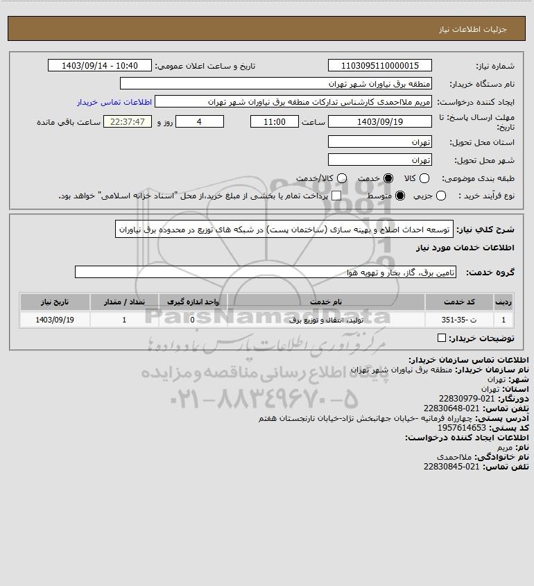 استعلام توسعه احداث اصلاح و بهینه سازی (ساختمان پست) در شبکه های توزیع در محدوده برق نیاوران, استعلام توسعه احداث اصلاح و بهینه سازی (ساختمان پست) در شبکه های توزیع در محدوده برق نیاوران