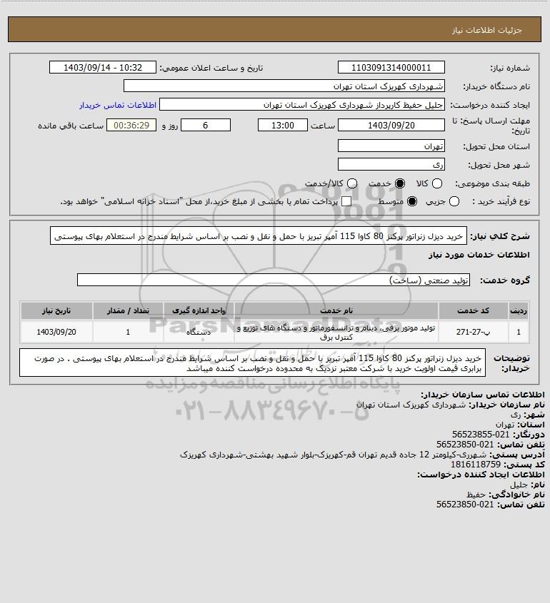 شرح کلی نیاز: خرید دیزل زنراتور پرکنز 80 کاوا 115 آمپر تبریز با حمل و نقل و نصب بر اساس شرایط مندرج در استعلام بهای پیوستی