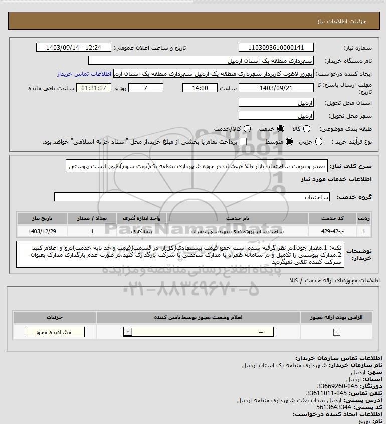 شرح کلی نیاز: تعمیر و مرمت ساختمان بازار طلا فروشان در حوزه شهرداری منطقه یک(نوبت سوم)طبق لیست پیوستی