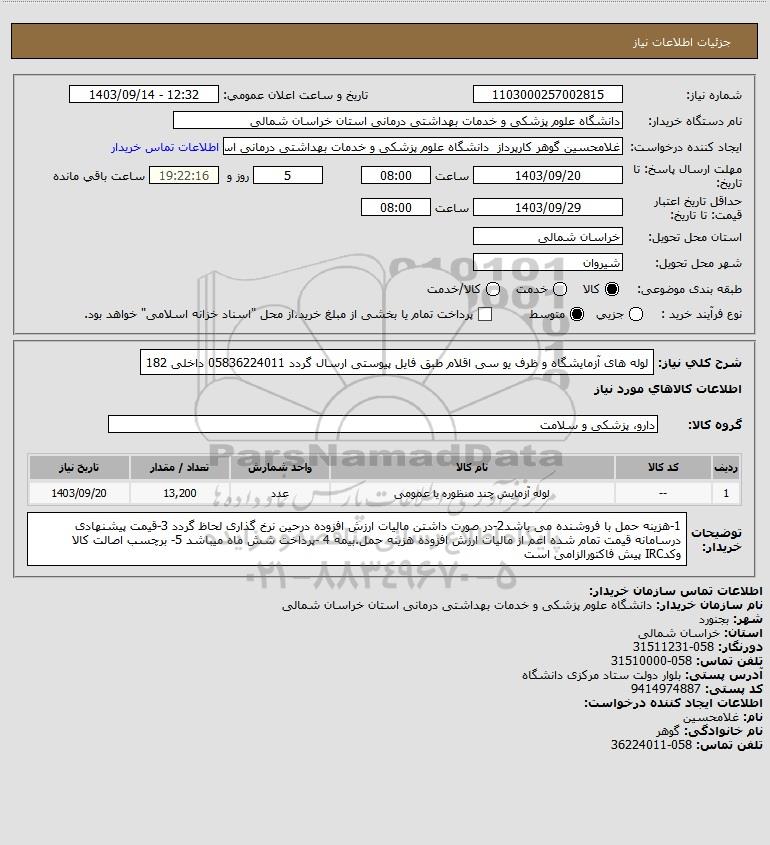 شرح کلی نیاز: لوله های آزمایشگاه و ظرف یو سی اقلام طبق فایل پیوستی ارسال گردد 05836224011 داخلی 182