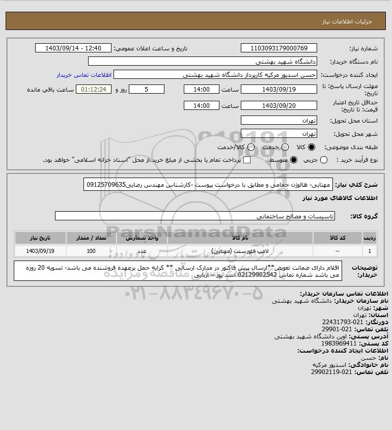 | 1 | -- | لامپ فلورسنت (مهتابی) | عدد | 100 | 1403/09/19 |