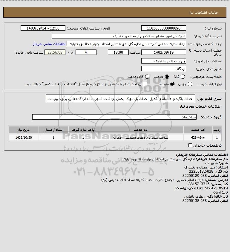 شرح کلی نیاز: احداث پاگرد و جانپناه و تکمیل احداث پل دورک بخش رودشت شهرستان لردگان طبق برآورد پیوست
