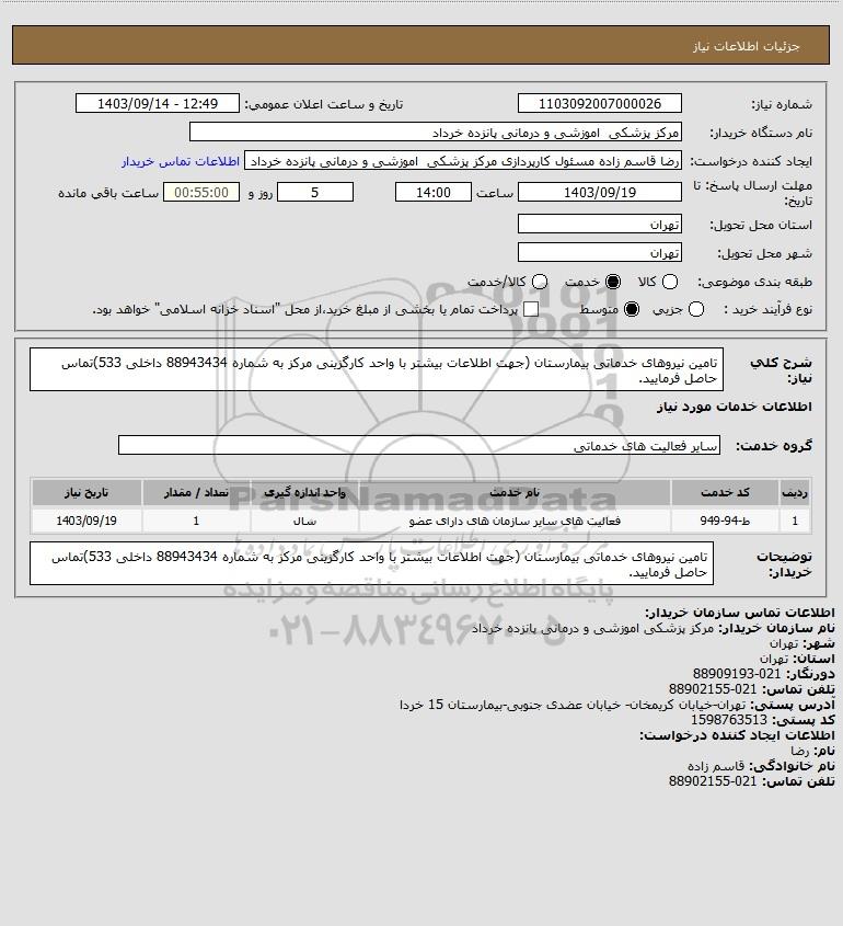 شرح کلی نیاز: تامین نیروهای خدماتی بیمارستان (جهت اطلاعات بیشتر با واحد کارگزینی مرکز به شماره 88943434 داخلی 533)تماس حاصل فرمایید.