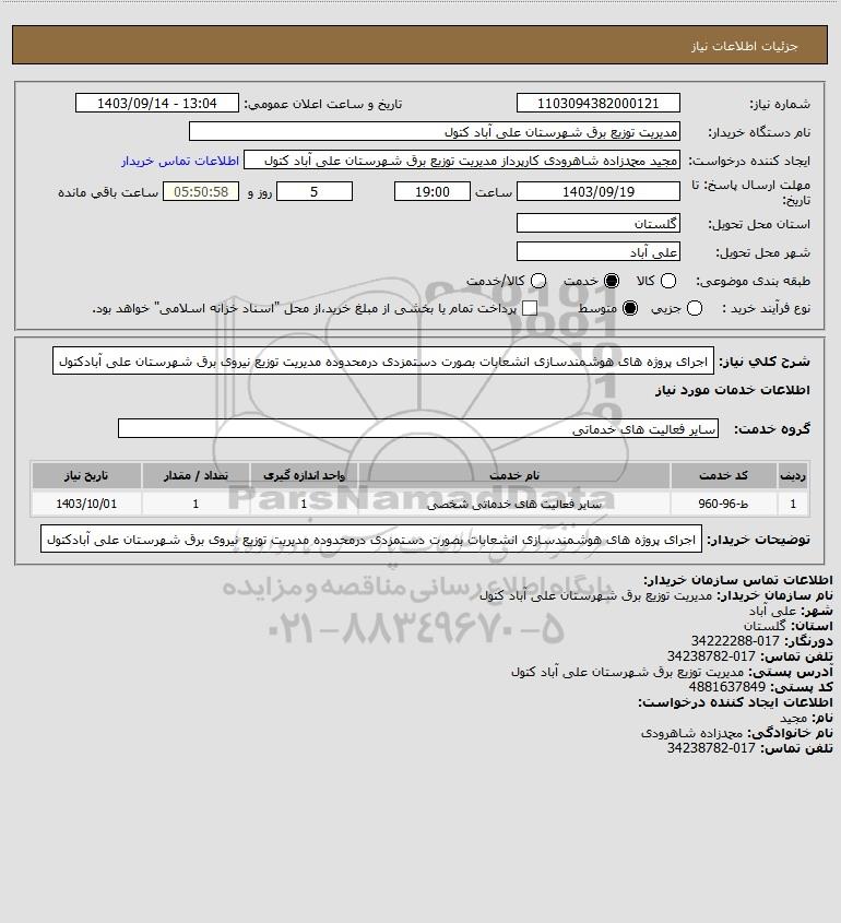 شرح کلی نیاز: اجرای پروژه های هوشمندسازی انشعابات بصورت دستمزدی درمحدوده مدیریت توزیع نیروی برق شهرستان علی آبادکتول