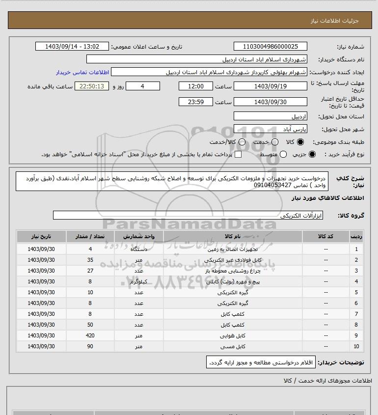 شرح کلی نیاز: درخواست خرید تجهیزات و ملزومات الکتریکی برای توسعه و اصلاح شبکه روشنایی سطح شهر اسلام آباد.نقدی (طبق برآورد واحد ) تماس 09104053427