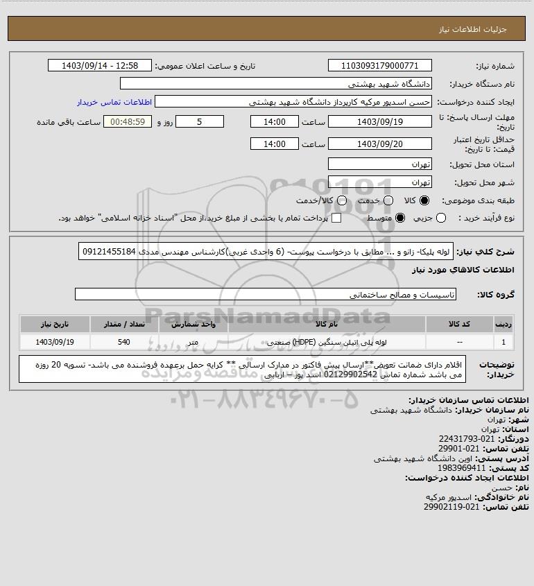 شرح کلی نیاز: لوله پلیکا- زانو و ... مطابق با درخواست پیوست- (6 واحدی غربی)کارشناس مهندس مددی 09121455184