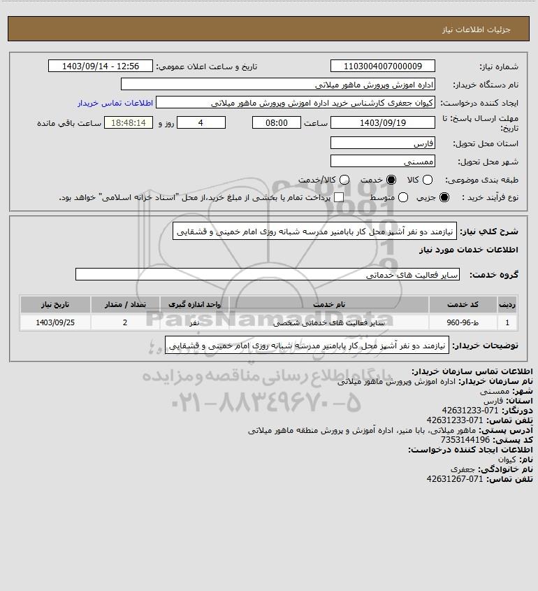 شرح کلی نیاز: نیازمند دو نفر آشپز محل کار بابامنیر مدرسه شبانه روزی امام خمینی و قشقایی