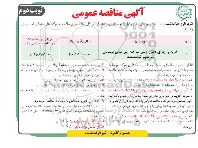 مناقصه خرید و اجرای دیوار پیش ساخته پیرامونی بوستان بام شهر نوبت دوم, مناقصه خرید و اجرای دیوار پیش ساخته پیرامونی بوستان بام شهر نوبت دوم