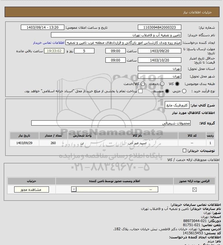 | 1 | -- | اسید غیر آلی | تن | 260 | 1403/09/29 |