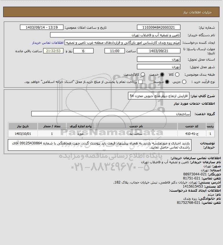 شرح کلی نیاز: افزایش ارتفاع دیوار ضلع جنوبی مخزن 54