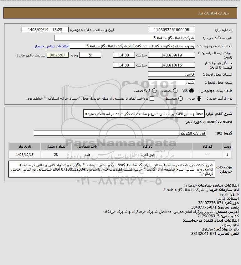 شرح کلی نیاز: fuse و سایر اقلام بر اساس شرح و مشخصات ذکر شده در استعلام ضمیمه