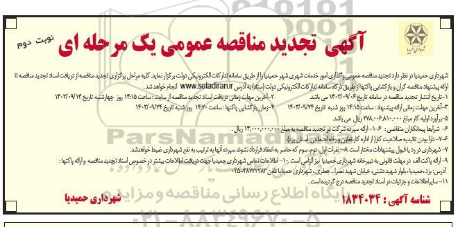 شهرداری حمیدیا در نظر دارد تجدید مناقصه عمومی واگذاری امور خدمات شهری شهر حمیدیا را از طریق سامانه تدارکات الکترونیکی دولت برگزار نماید. کلیه مراحل برگزاری تجدید مناقصه از دریافت اسناد مناقصه تا ارائه پیشنهاد مناقصه گران و بازگشایی پاکتها از طریق درگاه سامانه تدارکات الکترونیکی دولت ستاد به آدرس سایت ستاد ایران انجام خواهد شد.