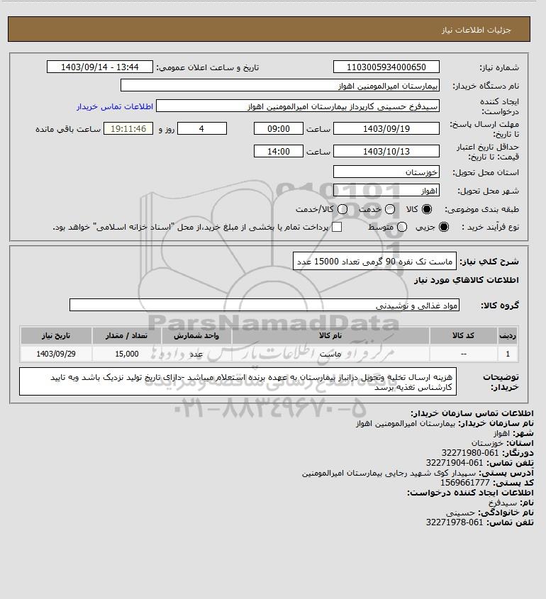 شرح کلی نیاز: ماست تک نفره 90 گرمی تعداد 15000 عدد