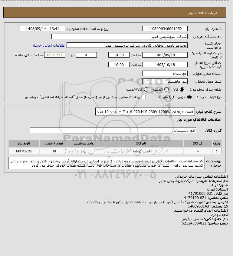 شرح کلی نیاز: المنت میله ای T + H 070 HLP 230V 1200W = تعداد 10 عدد