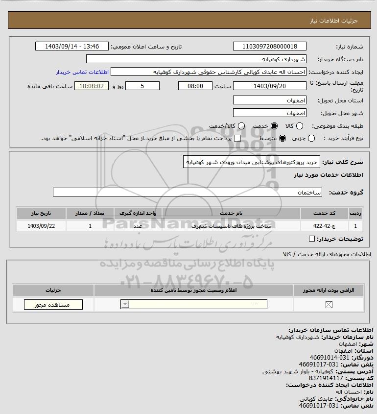شرح کلی نیاز: خرید پروزکتورهای روشنایی میدان ورودی شهر کوهپایه