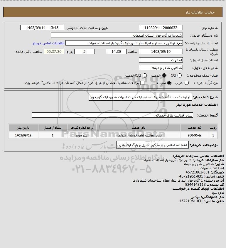 شرح کلی نیاز: اجاره یک دستگاه خودروی استیجاری جهت امورات شهرداری گزبرخوار