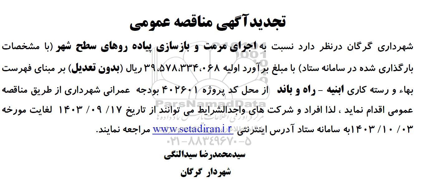 شهرداری گرگان در نظر دارد نسبت به اجرای مرمت و بازسازی پیاده روهای سطح شهر (با مشخصات بارگذاری شده در سامانه ستاد) با مبلغ براورد اولیه 39.578.334.068 ریال (بدون تعدیل) بر مبنای فهرست بها و رسته کاری ابنیه - راه و باند از محل کد پروژه 402601 بودجه عمرانی شهرداری از طریق مناقصه عمومی اقدام نماید ، لذا افراد و شرکت های واجد الشرایط می توانند از تاریخ 1403.09.17 لغایت مورخه 1403.10.03 به سامانه ستاد آدرس اینترنتی سایت ستاد ایران مراجعه نمایند.