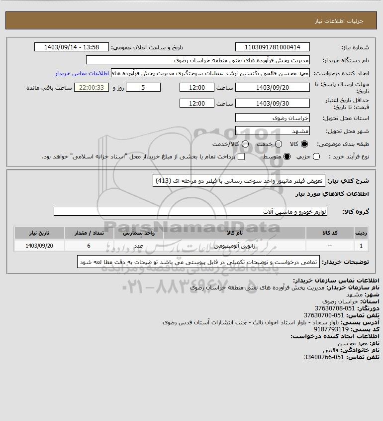 استعلام تعویض فیلتر مانیتور واحد سوخت رسانی با فیلتر دو مرحله ای (413), استعلام تعویض فیلتر مانیتور واحد سوخت رسانی با فیلتر دو مرحله ای (413)