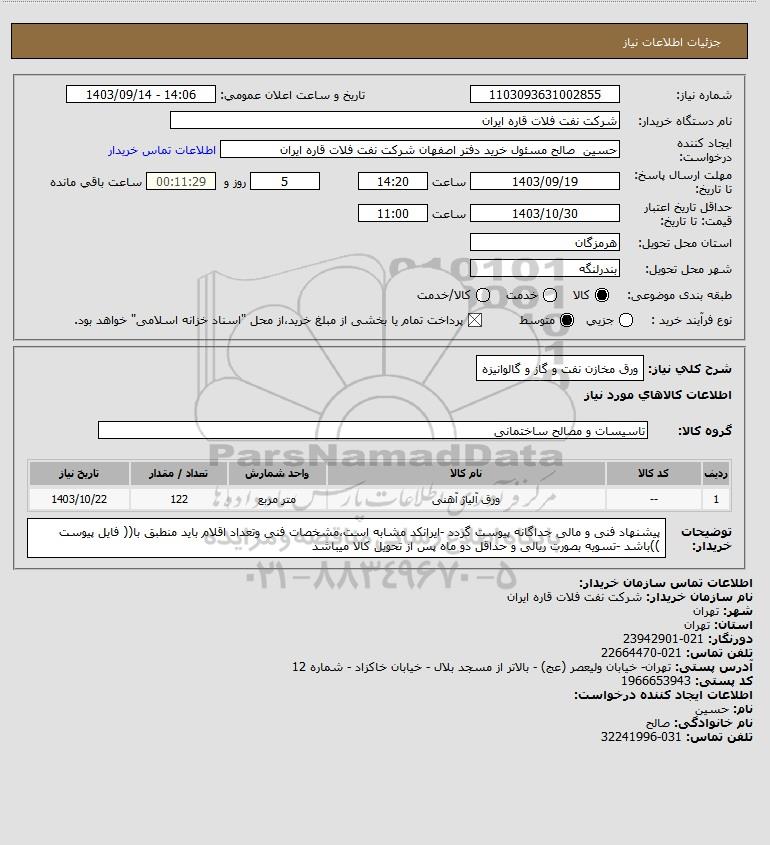 شرح کلی نیاز: ورق مخازن نفت و گاز و گالوانیزه