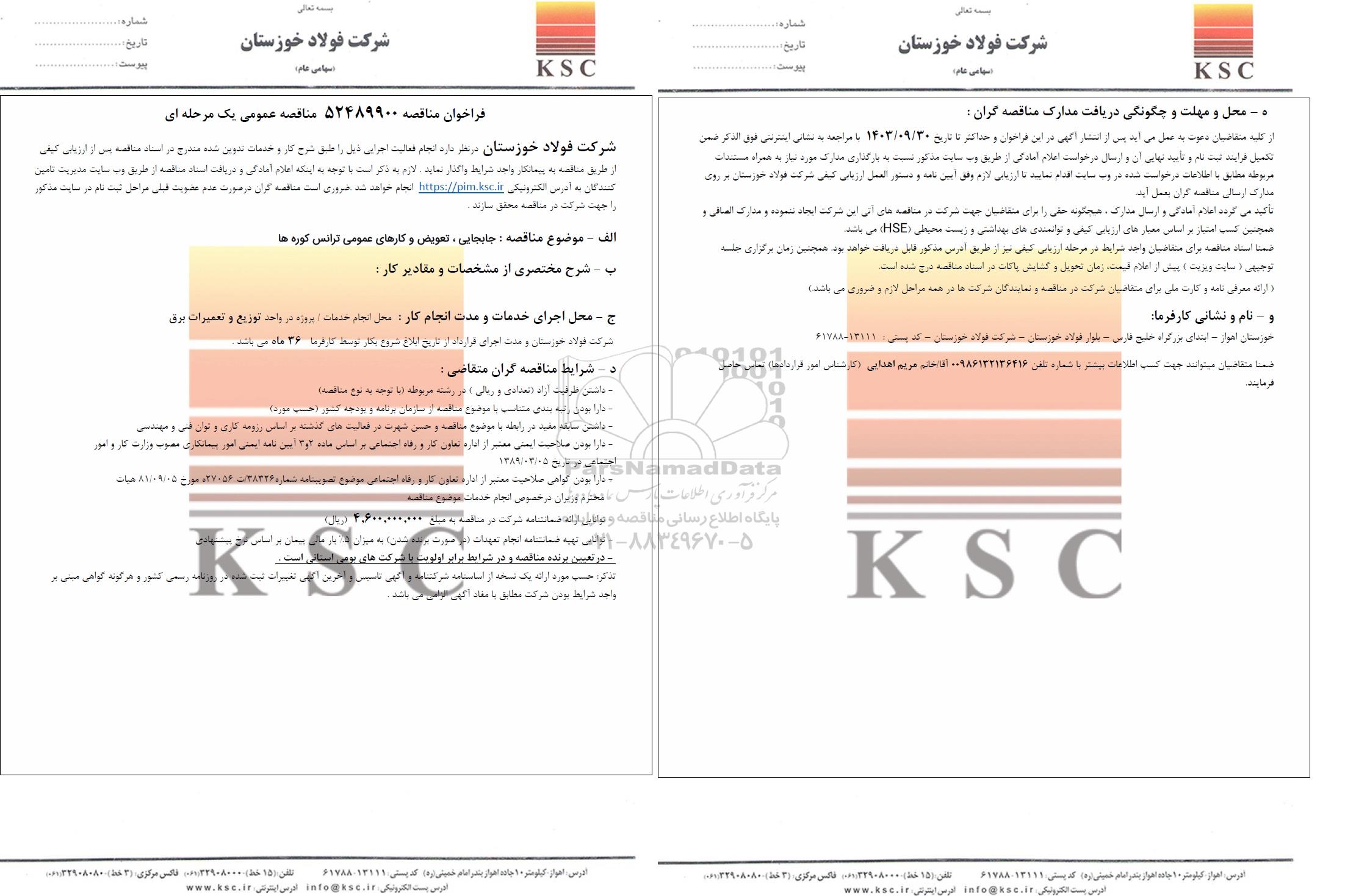 شرکت فولاد خوزستان در نظر دارد انجام فعالیت اجرایی ذیل را طبق شرح کار و خدمات تدوین شده مندرج در اسناد مناقصه پس از ارزیابی کیفی از طریق مناقصه به پیمانکار واجد شرایط واگذار نماید. لازم به ذکر است با توجه به اینکه اعلام آمادگی و دریافت اسناد مناقصه از طریق وب سایت مدیریت تامین کنندگان به آدرس الکترونیکی https://pim.ksc.ir انجام خواهد شد. ضروری است مناقصه گران در صورت عدم عضویت قبلی مراحل ثبت نام در سایت مذکور را جهت شرکت در مناقصه محقق سازند .