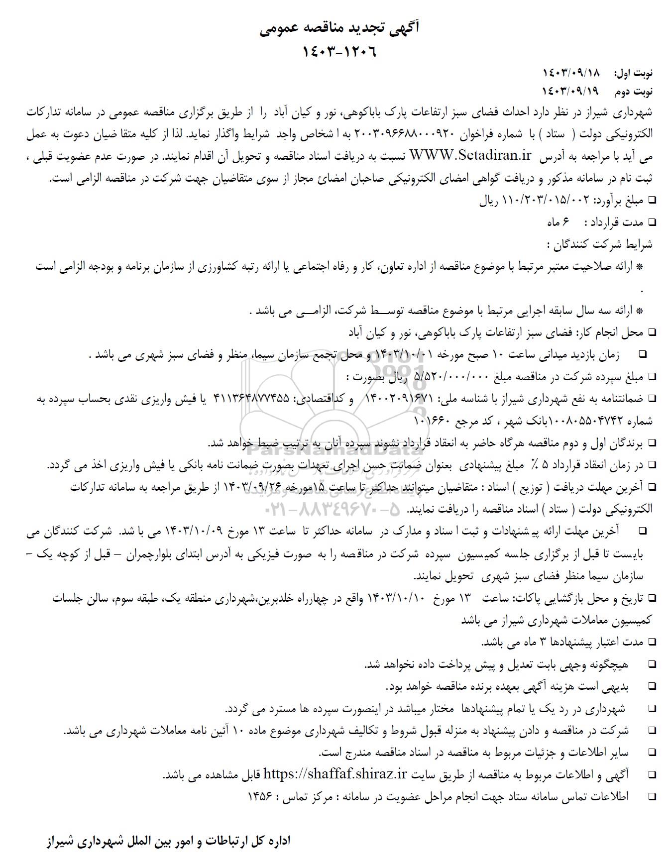 شهرداری شیراز در نظر دارد احداث فضای سبز ارتفاعات پارک باباکوهی، نور و کیان آباد را از طریق برگزاری مناقصه عمومی در سامانه تدارکات الکترونیکی دولت (ستاد) با شماره فراخوان 2003096688000920 به اشخاص واجد شرایط واگذار نماید. لذا از کلیه متقاضیان دعوت به عمل می آید با مراجعه به آدرس سایت ستاد ایران نسبت به دریافت اسناد مناقصه و تحویل آن اقدام نمایند در صورت عدم عضویت قبلی ، ثبت نام در سامانه مذکور و دریافت گواهی امضای الکترونیکی صاحبان امضای مجاز از سوی متقاضیان جهت شرکت در مناقصه الزامی است.