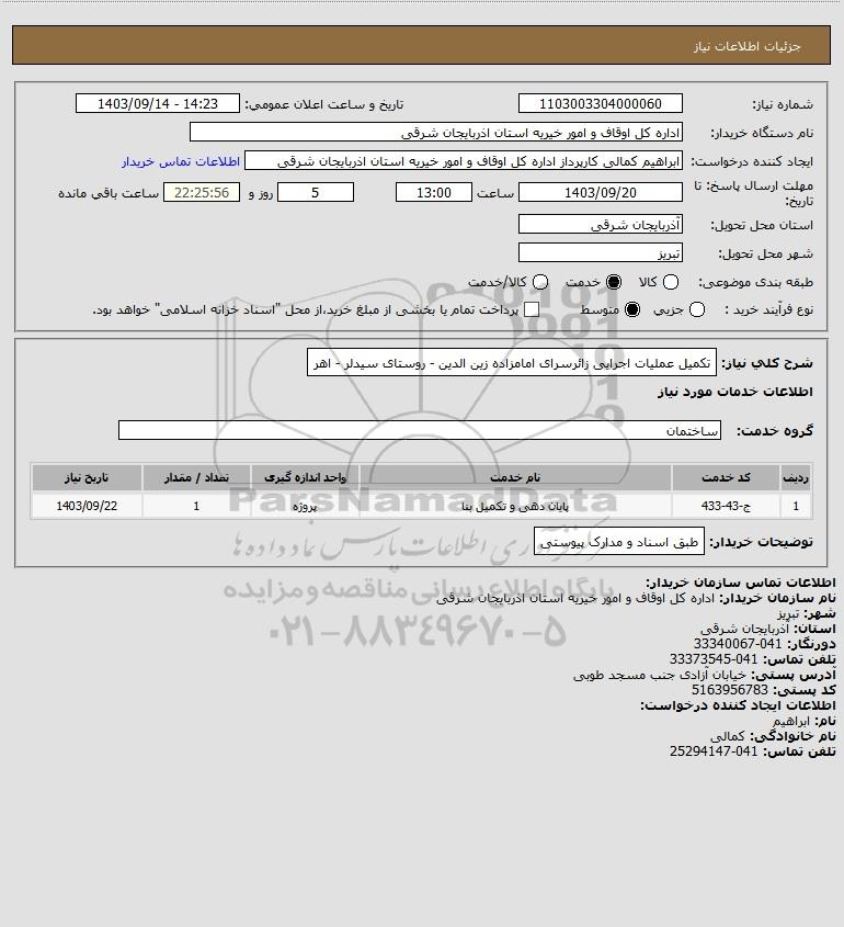 شرح کلی نیاز: تکمیل عملیات اجرایی زائرسرای امامزاده زین الدین - روستای سیدلر - اهر