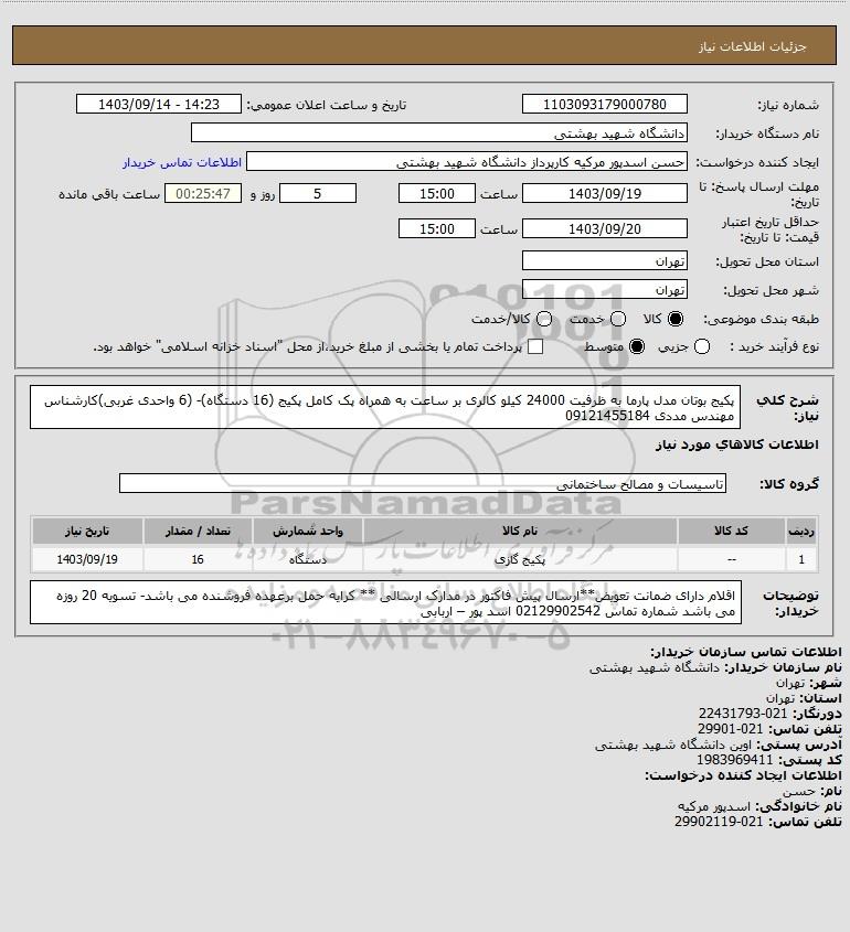 | 1 | -- | پکیج گازی | دستگاه | 16 | 1403/09/19 |