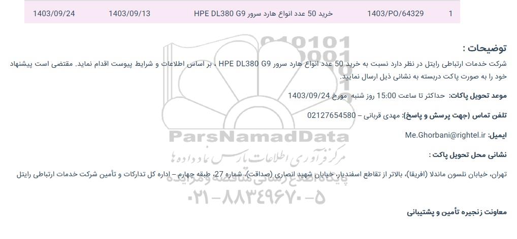 شرکت خدمات ارتباطی رایتل در نظر دارد نسبت به خرید 50 عدد انواع هارد سرور HPE DL380 G9 ، بر اساس اطلاعات و شرایط پیوست اقدام نماید مقتضی است پیشنهاد خود را به صورت پاکت در بسته به نشانی ذیل ارسال نمایید.