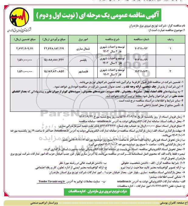 1 403110092 توسعه و احداث شهری فاز 2 سال 1403  شمال ساری  32.448.182.219 2.672.409.111