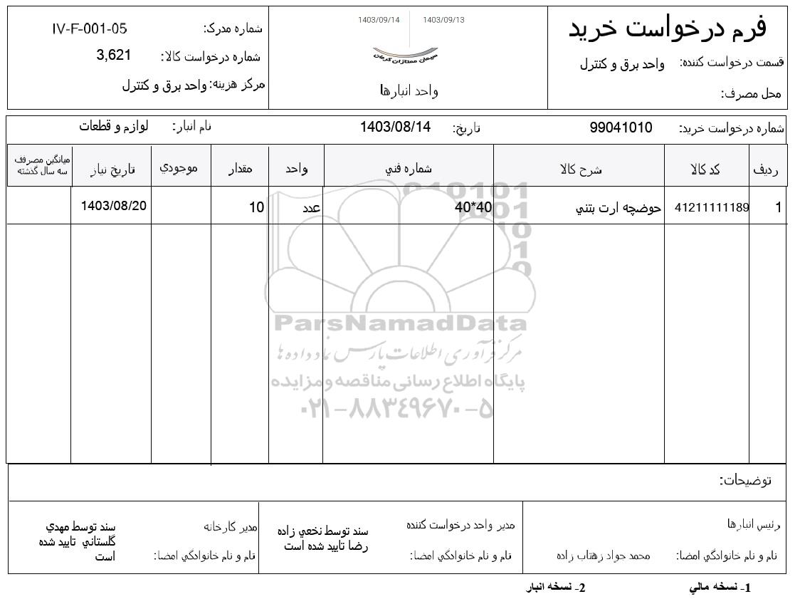 | ردیف | کد کالا | شماره فنی | مقدار | واحد |